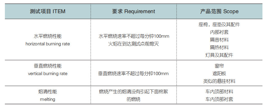 2.目前國家對汽車內飾材料的標準隻有GB8410-2006,該標準對部分內飾材料缺乏對真實試驗的模擬。而除了汽車,客車、校車等大型車輛對內飾材料燃燒的條款也是引用自GB8410-2006。長途客車大量配備窗簾懸掛物,按汽車燃燒標準來對其評價是缺乏參考意義的。目前客車內飾材料的燃燒特性標準正在起草討論中。希望此標準實施能完善目前標準的弊端。如果需要對材料進行全真實的評價體係,除去阻燃性,還有霧化性能、車內VOC測試,材料常規性能測試全麵進行評價。